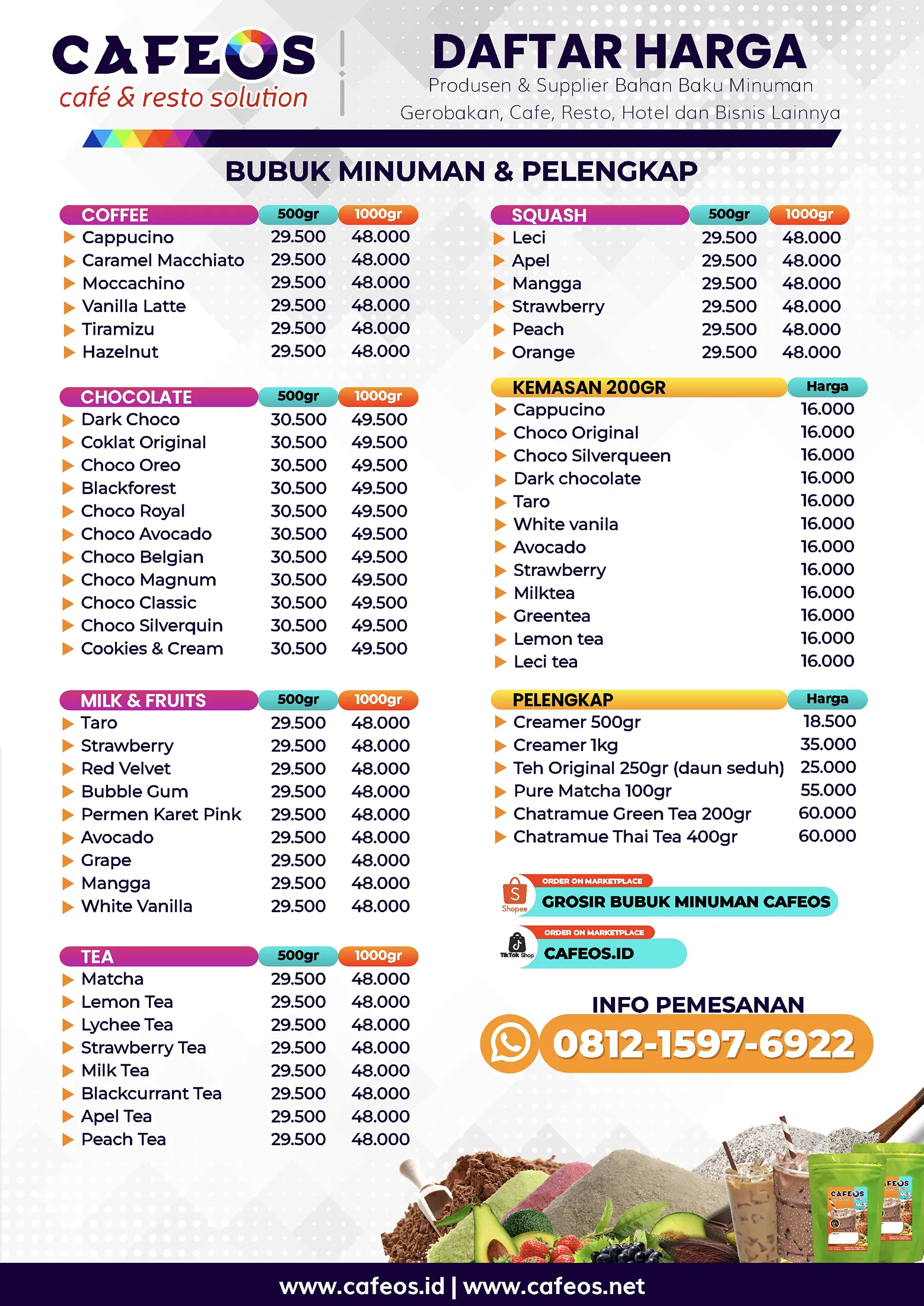 Cafeos.net siap menjadi supplier bahan baku bubuk minuman dan topping untuk Cafe atau usaha minuman Anda. Bubuk minuman Cafeos dapat dibeli dengan grosir atau juga eceran kiloan dengan harga mulai 16 ribuan saja.
